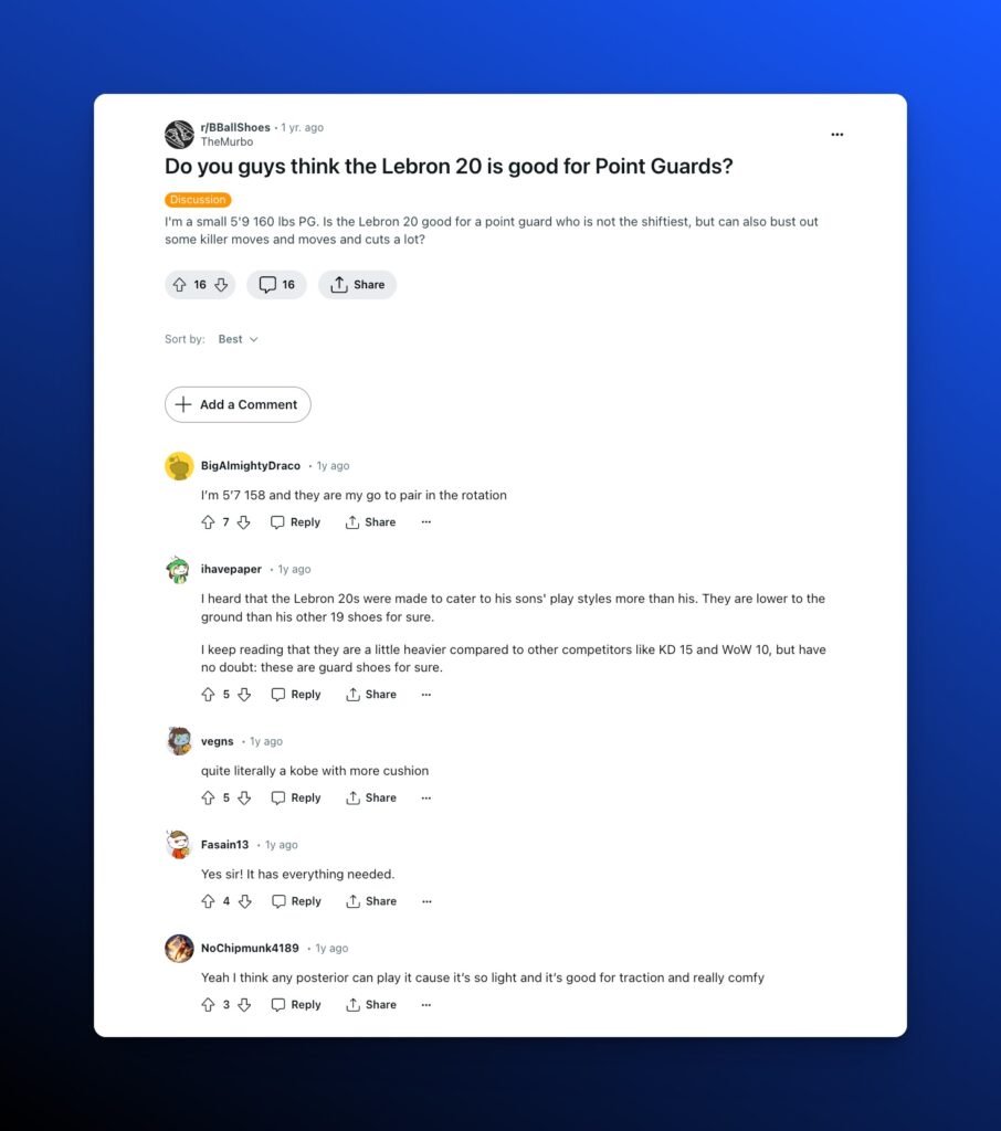 - Reddit Appearance: A detailed analysis or review thread where users debate the LeBron 20s value, focusing on its design, durability, and performance specifically for point guards.