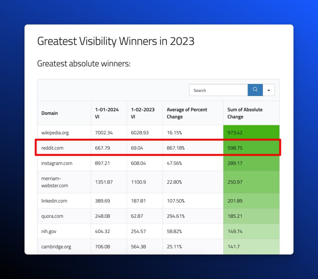 The questionable increase in visibility of Reddit was highlighted by Lily Ray of Amsive Digital in her annual 2023 SEO winners and losers. Reddit saw an increased visibility of 867% in 2023.
