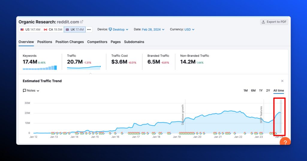 Reddit’s organic search visibility has been skyrocketing since June of 2023. From ~80M visits to ~500M in 9 months. That’s unprecedented.