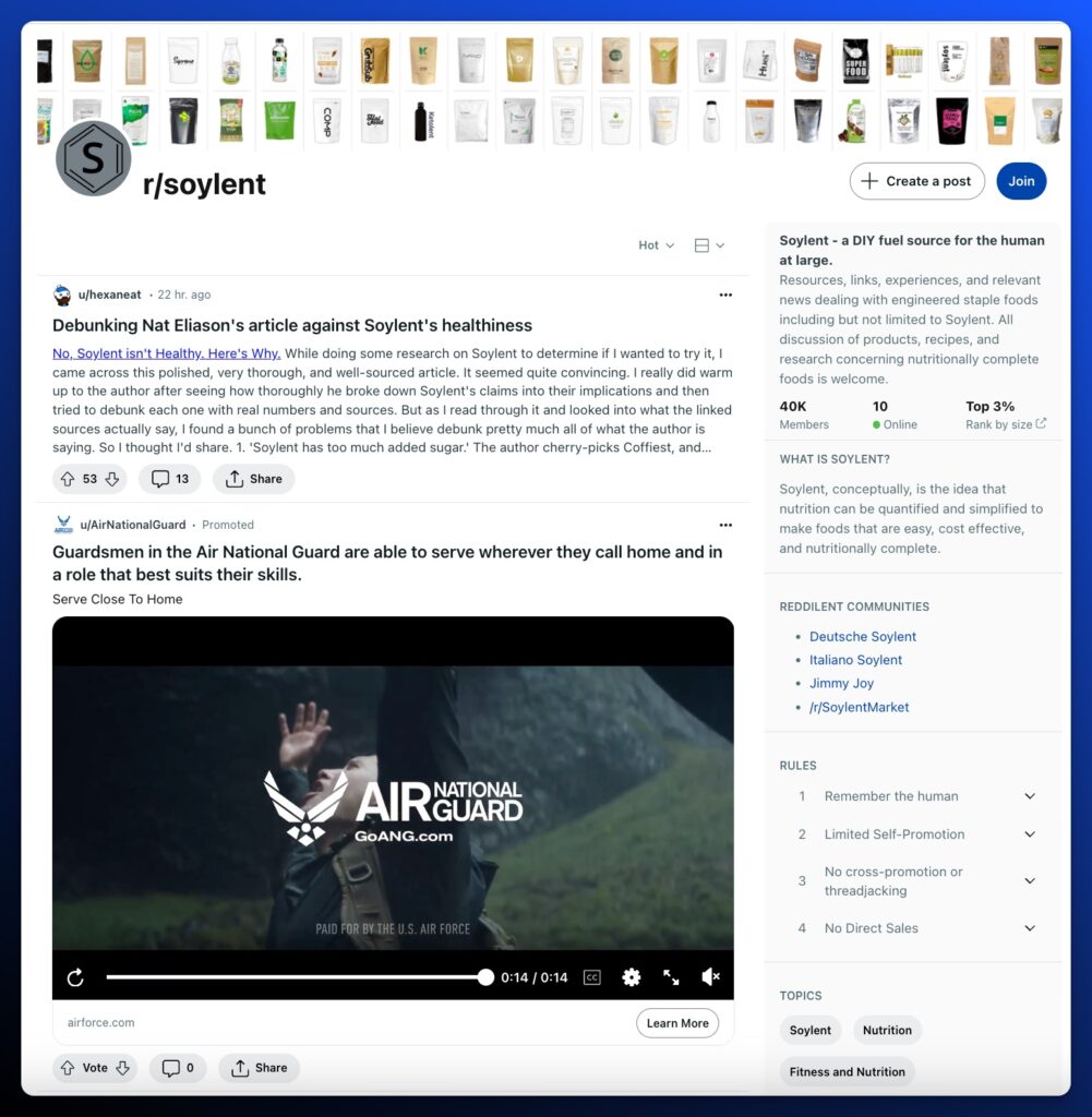 The Soylent subreddit community is incredibly active and slightly cultish. Posts cover everything from health recommendations, recipes, memes, the products in public spaces, deals, and academic research. The founder drops in from time to time and the employees have an active presence in many of the threads.