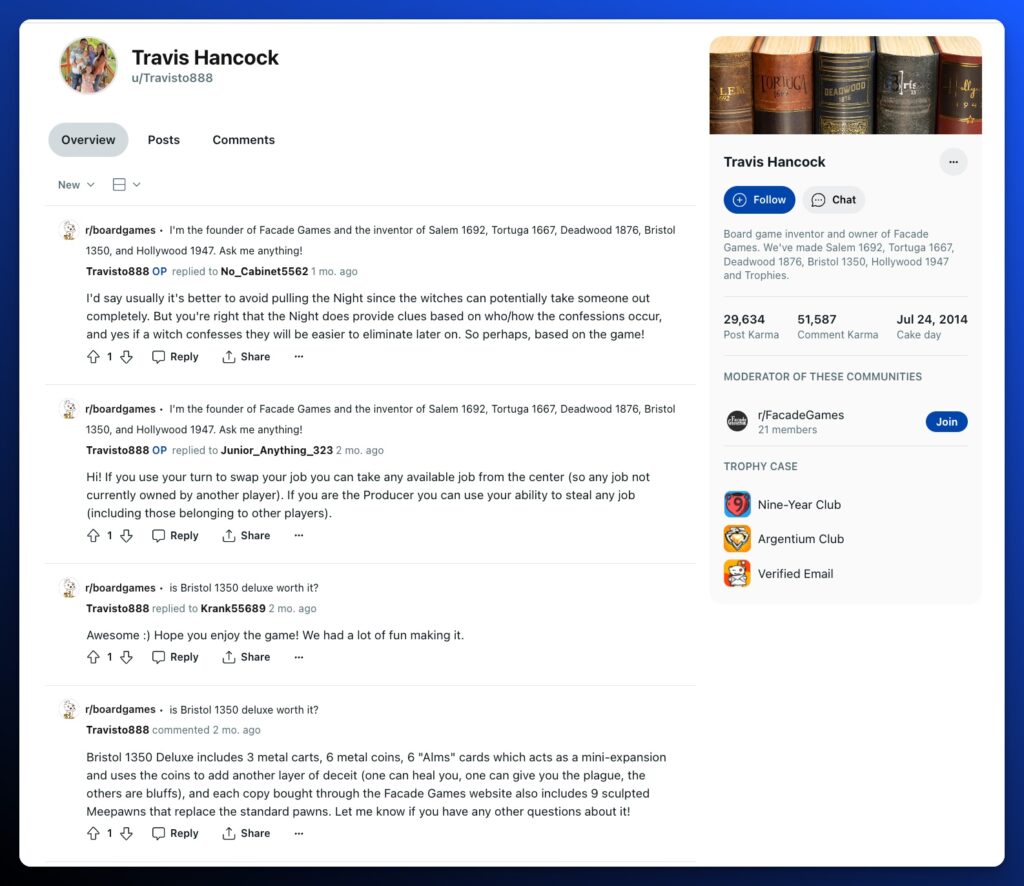 - Bio: Travis is a Columbus, Ohio-based board game inventor and publisher, who launched his first game, Salem 1692, in 2015 through his company, Facade Games. With a strong reception on Kickstarter, Travis transitioned from part-time game development to pursuing his passion full-time alongside his family, eventually achieving significant success with six published games and nearly half a million copies sold.