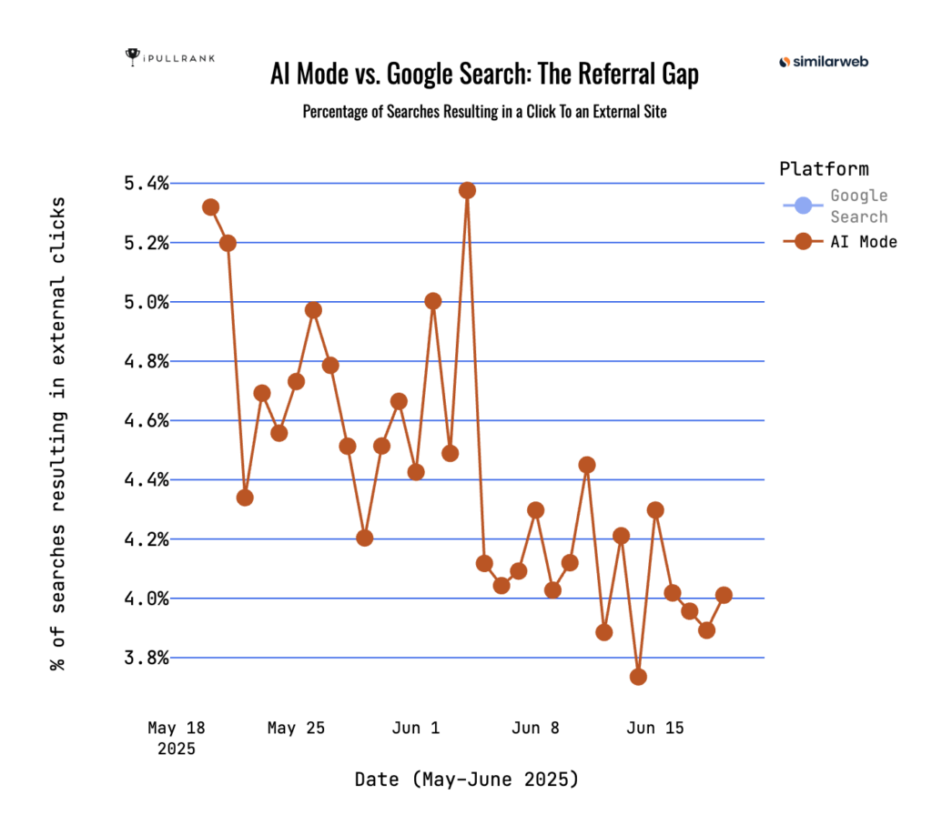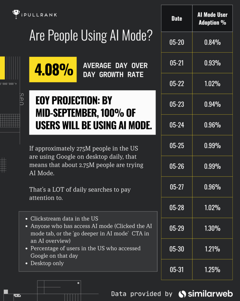 No. iPullRank has the privilege of working with SimilarWeb on AI Mode data analysis. In our initial report, SimilarWeb provided Elias Dabbas and our team with daily relative data points from over 100K AI Mode users between the timeframe of May 20th (AI Mode’s public launch date) to June 19th on the following metrics: