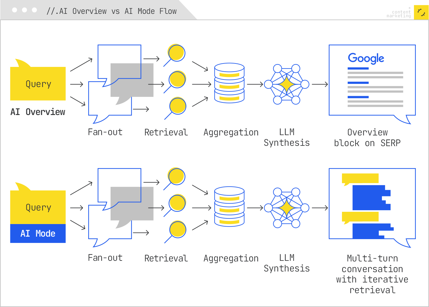 AI Overviews aim for brevity and clarity, so synthesis is constrained. Think of them as a single-shot generation pass with a fixed token budget. AI Mode, by contrast, is conversational and persistent. It can run additional retrieval cycles mid-session, incorporate follow-up questions, and adjust the synthesis style on the fly.