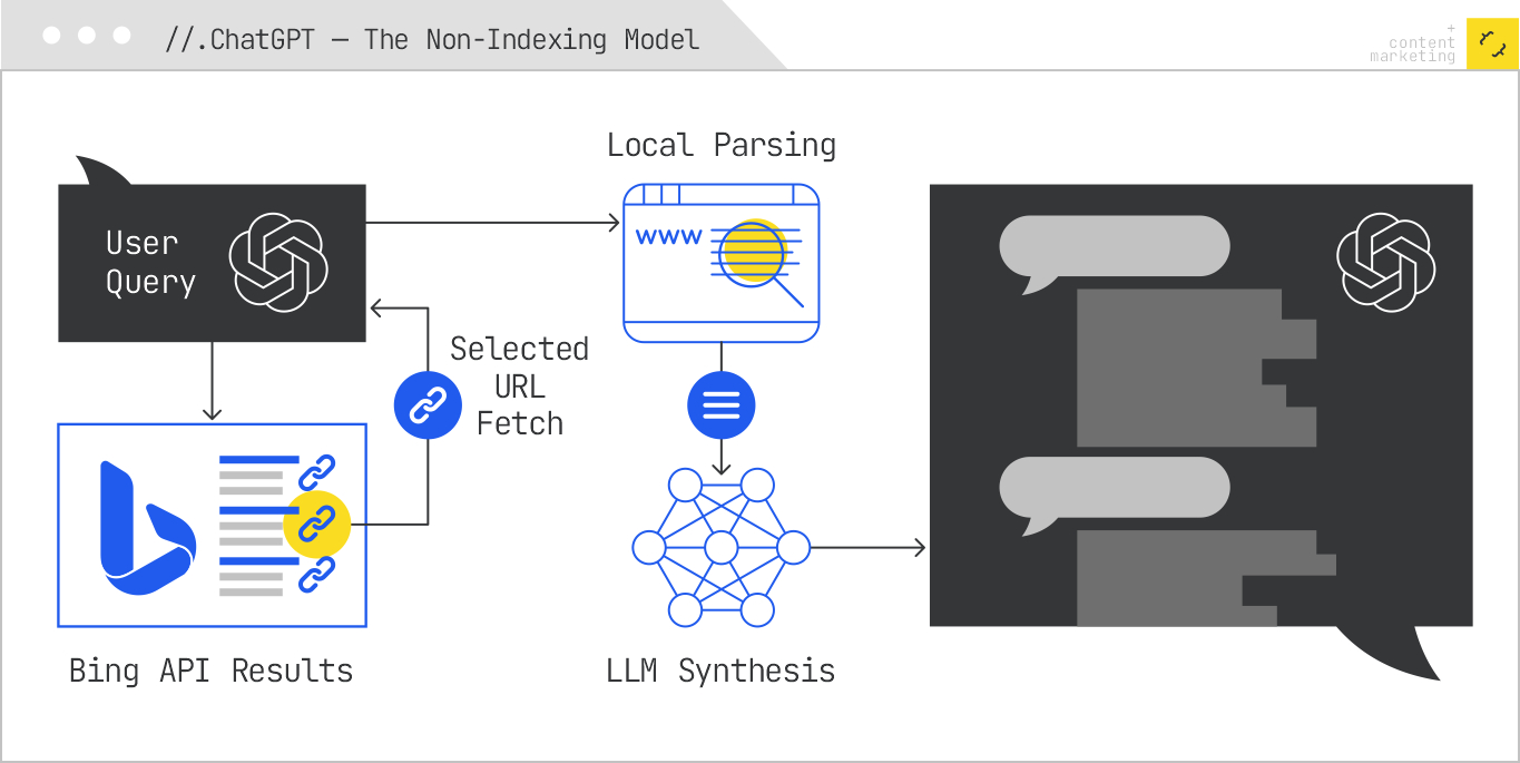 Base ChatGPT models do not maintain their own web index. They are trained on a massive static corpus, but pull URLs from indices and request them in real time. ChatGPT generates search queries, sending them to Bing’s API, and retrieves a short list of URLs. It then fetches the full content of selected URLs at runtime and processes them directly for synthesis.