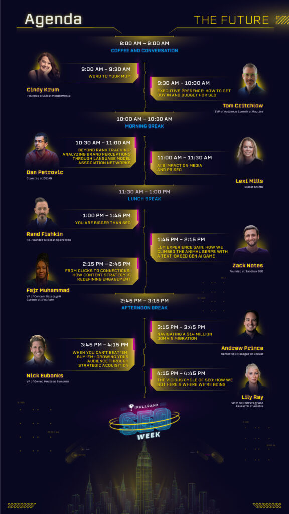 Where do we go from here? There were actionable takeaways in every presentation, but the final day of SEO Week brought a forward-looking perspective. Speakers centered on the strategic shifts shaping the future of search and digital visibility.