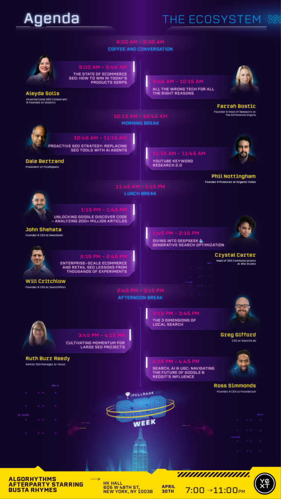 And that future is already here, to which our nearly 300 attendees can attest! With dozens of expert speakers and breakout events like the Algorhythms Afterparty – starring Busta Rhymes – SEO Week was a celebration of both community and innovation. The engagement, the curiosity, and the high-level conversations made it clear that the SEO industry is ready to meet this new frontier head-on.