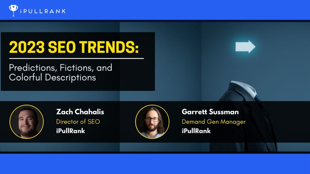 In this webinar, Garrett Sussman and Zach Chahalis review 2022 trends in the SEO industry, including Contextual SEO, eCommerce SERP changes, Entity SEO, SEO in a recession and the boring SEO fundamentals. They also explored 2023 predictions from the SEO community.