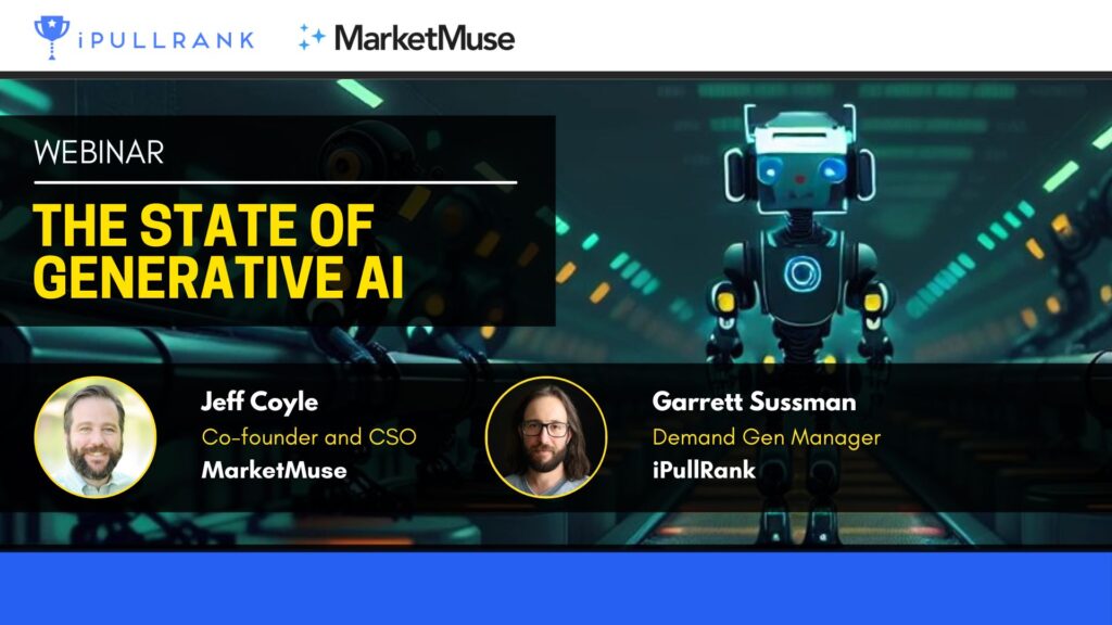 In this webinar, Jeff Coyle of MarketMuse and Garrett Sussman of iPullRank analyze and discuss the results of the State of Generative AI Report. They highlight insights around generative Al for idea generation, trust and adoption, and how organizations should think about a generative AI content strategy.