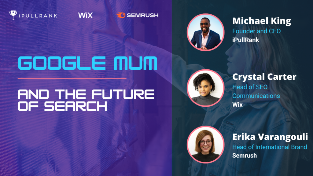 iPullRank founder Michael King sat down with Erika Varangouli, Head of International Brand at Semrush, and Crystal Carter, Head of SEO Communications at Wix, to talk about Google MUM. In this webinar, they discussed Google MUM and the dramatic changes that are coming.